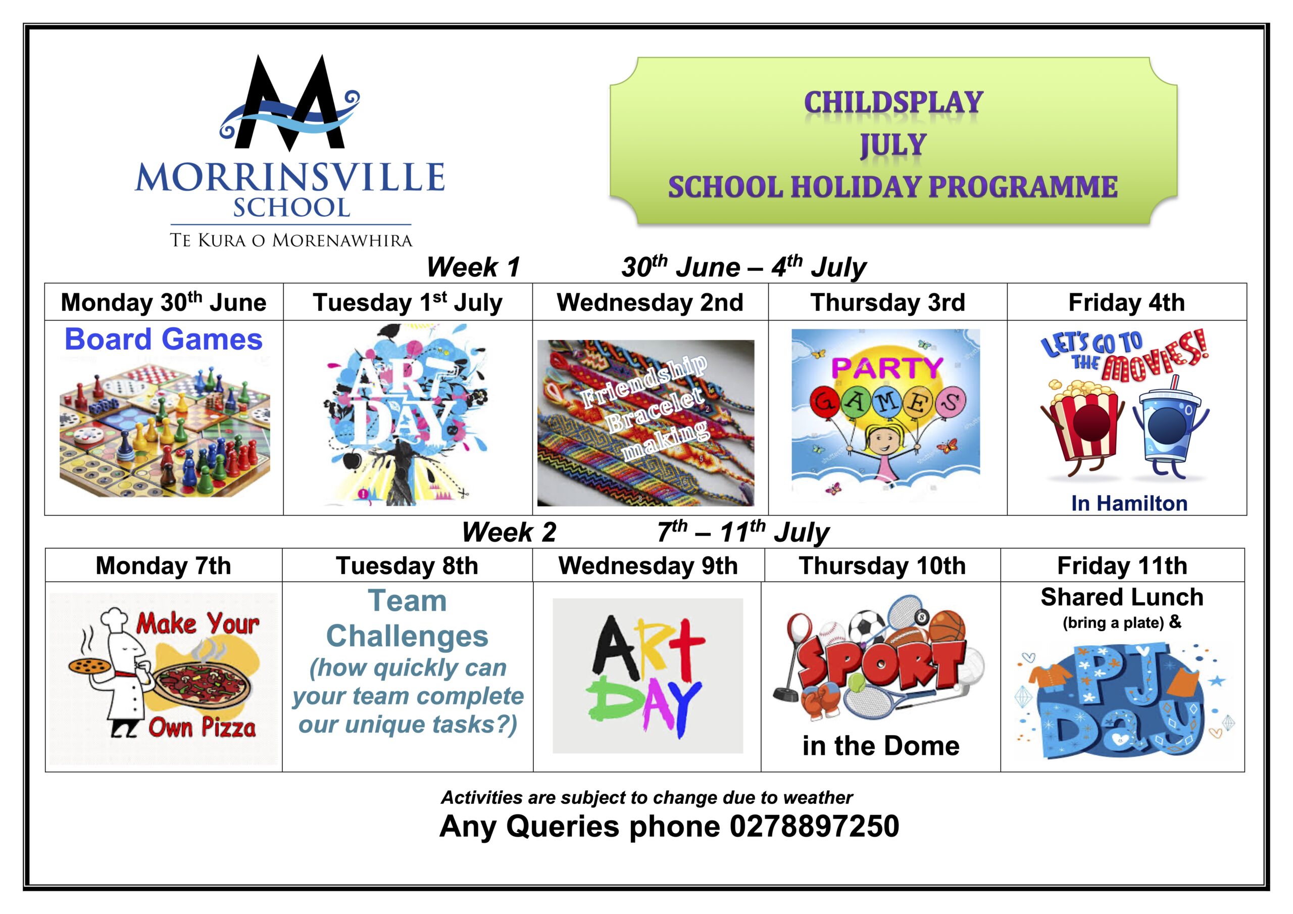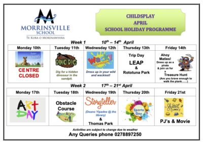 After school care and holiday programmes are provided through Morrinsville School’s CHILDSPLAY Programme.  The children from all local primary schools attend the ChildsPlay after school care programme and holiday programme.